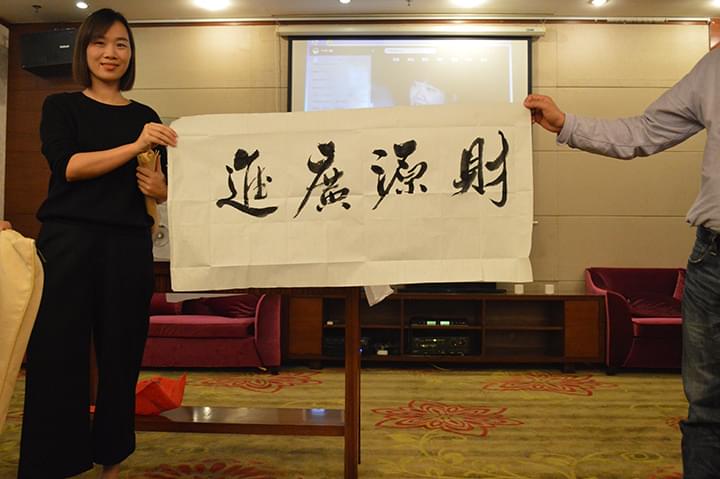 倉庫主管葉紅斌展示毛筆字預(yù)祝美創(chuàng)達(dá)誠2016:財(cái)源廣進(jìn)