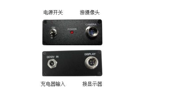 將電源盒跟液晶顯示器裝配到伸縮桿上后1,將液晶顯示器的信號線插入 DISPLAY 的孔位2,將攝像頭的信號線插入 CAMERA 的孔位3,開關(guān)撥到 ON 位置為“開”OFF 位置為“關(guān)”