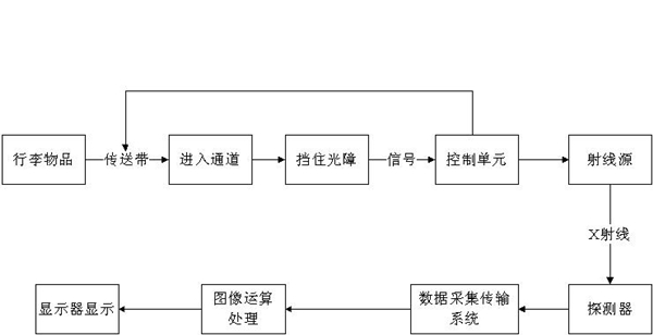 物品進(jìn)入通道式X射線安檢機(jī)通道后,檢測(cè)裝置將相關(guān)信息送至控制單元,由控制單元觸發(fā)X射線源發(fā)射X射線。X射線經(jīng)過(guò)準(zhǔn)直器后形成非常窄的扇形射線束,穿透?jìng)魉蛶系男欣钗锲仿涞教綔y(cè)器上,探測(cè)器把接收到的X射線變?yōu)殡娦盘?hào),這些很弱的電流信號(hào)被放大后量化,通過(guò)通用串行總線傳送到工業(yè)控制計(jì)算機(jī)作進(jìn)一步處理,經(jīng)過(guò)復(fù)雜的運(yùn)算和成像處理后得到高質(zhì)量的圖像。其工作原理如圖所示: